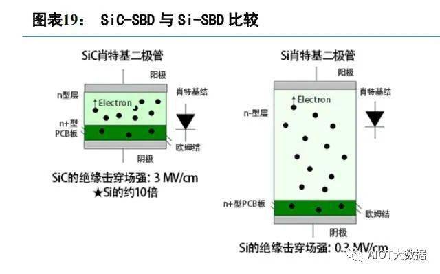 此外,SiC-SBD 还拥有正向特性以及优异的 TRR 特性,而且几乎没有温度及电流依赖性。当前主流的 SiC-SBD 产品耐压极限为 1200V,同时罗姆公司在推进 1700V 耐压的产品。(2)SiC-PIN 是一个在射频和微波频段受偏置电流控制的可变阻抗器.它的结构有三层,在碳化硅半导体二极管的 P 结和N结中间夹着高阻值的本 征 I 层。与硅基 PIN 二极管相比,碳化硅 PIN 二极管具有高于硅的 2-3个数量级的开关速度、高结温承受能力、 高电流密度以及更高的功率密度。(3)由于 SBD 和 PiN 二极管为主的传统二极管己无法满足高频、大功率、低 功耗的市场需求,前者击穿电压低、反向漏电大,而后者高频特性较差,由此 JBS 应运而生,该结构将 SBD 结构 和 PiN 结构巧妙地结合在一起,具有高耐压、低压降、小漏电、高频特性好及强抗过压和浪涌电流能力,SiCJBS 较 Si-JBS 具有大电流密度、高工作结温的性能优势。